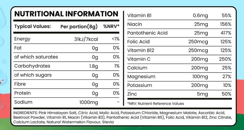 Pink Himalayan Salt, Citric Acid, Malic Acid, Potassium Chloride, Magnesium Malate, Ascorbic Acid, Beetroot Powder, Vitamin B1, Niacin (Vitamin B3), Pantothenic Acid (Vitamin B5), Folic Acid, Vitamin B12, Zinc Citrate, Calcium Lactate, Stevia, Watermelon Flavour
